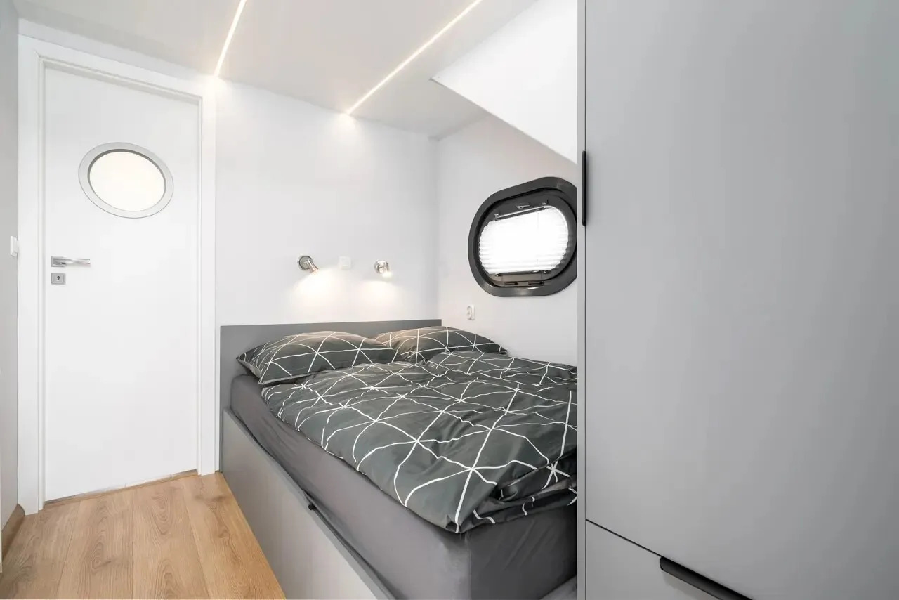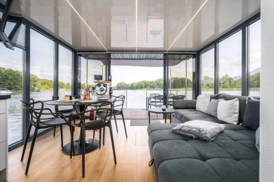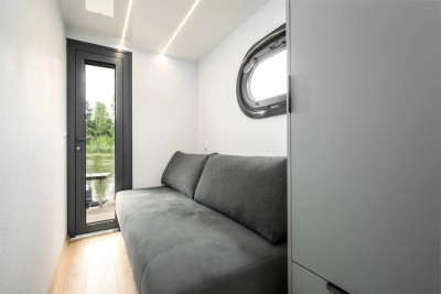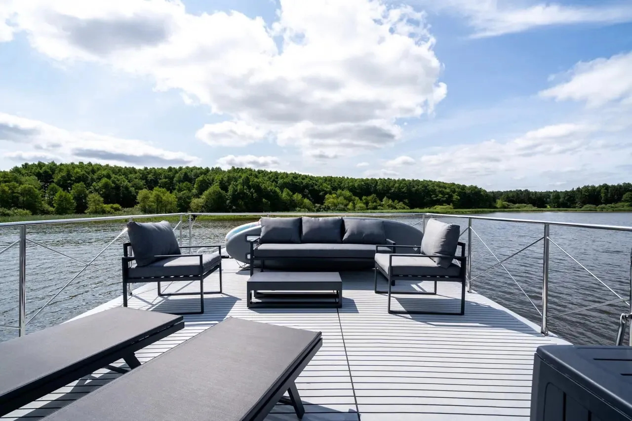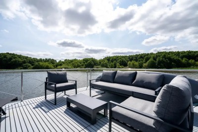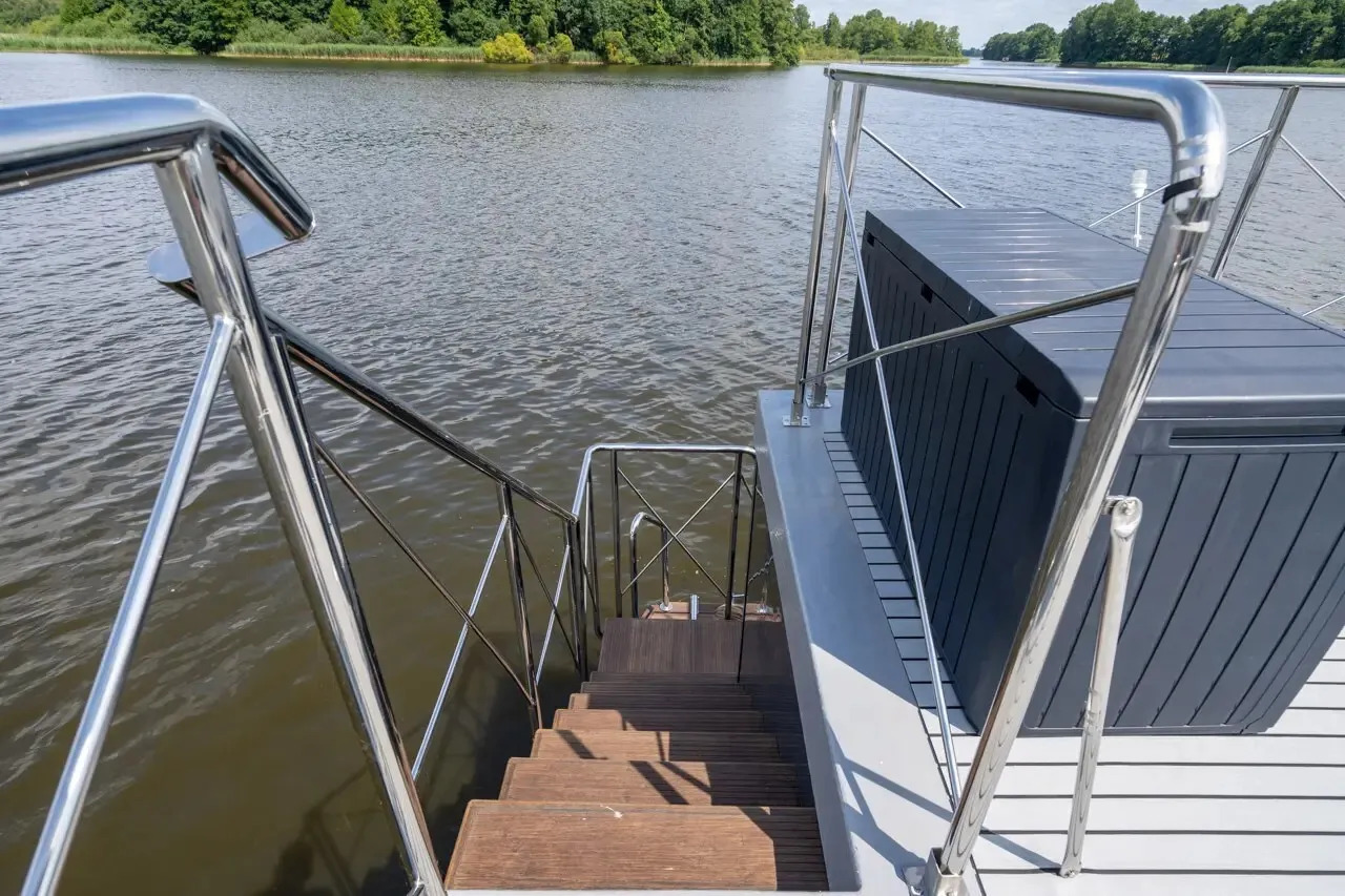 Infinity, das Hausboot der neuesten Generation. Die perfekte Kombination aus innovativer Antriebstechnik und stilvollem Design. Die lnfinity verfügt über hervorragende Fahr- und Manövriereigenschaften, sodass es für jeden die Möglichkeit gibt, einen traumhaften Urlaub auf dem Wasser zu verbringen. Ohne Führerschein. Der Wohn- und Essbereich ist mit bodentiefen Schiebe- bzw. Panoramafenstern ausgestattet so das Sie einen eindrucksvollen Ausblick auf die Natur und das Wasser genießen können. Im Salon befindet sich eine ausladende Wohnlandschaft, auf der man es sich so richtig bequem machen kann. Falls die zwei Schlafzimmer nicht ausreichen, gibt es die Möglichkeit, mit wenigen Handgriffen die Wohnlandschaft zu einem weiteren Doppelbett zu verwandeln. Bei Sonnenaufgang frühstücken auf der Bugterrasse kein Problem, Tisch und vier bequeme Stühle bieten ausreichend Platz für die ganze Familie. Hier befindet sich auch das Sonnensegel, das Sie anbringen können, falls es oben auf der Dachterrasse doch mal zu heiß wird. Runder Esstisch mit vier Stühlen. Steuerstand mit ,,Kapitänsstuhl". Ein Flachbildschirm-TV ist selbstverständlich auch vorhanden. Die angrenzende helle, moderne Küchenzeile besticht durch ihre cleane Eleganz. Sie ist mit allem ausgestattet, was man für einen entspannten Aufenthalt braucht. Bitte vergessen Sie nicht ihre Lieblings-Kaffeepads von Senseo mitzubringen. Das vollwertige Bad, mit großer Dusche, der Marmoroptik, seinen schwarzen Armaturen und dem Aufsatzwaschbecken besticht durch sein edles Design. Vom Salon aus erreichen Sie die beiden separaten Schlafzimmer, eins ist mit Doppelbett (140 cm x 200 cm) das zweite Schlafzimmer mit ausziehbarer Couch( Liegefläche140 x 200cm) ausgestattet. Beide Schlafzimmer verfügen über einen eigenen Zugang zur Heckterrasse. Mehr Privatsphäre geht nicht. Von der Heckterrasse aus bietet Ihnen eine Badeleiter und eine Badeplattform einen komfortablen Zugang zum Wasser. Ein weiteres Highlight ist die separate Außendusche mit Frischwasser, welche für Erfrischung an heißen Tagen sorgt. Ob Sport oder einfach nur ein gemütliches Treiben, mit dem SUP am Board welches inklusive ist, kann das unter Dir hinwegfließende Wasser, die Ruhe und die Natur um Dich beruhigend und entspannend für die Seele wirken . Über eine angenehm breite Holztreppe mit Geländer erreichen Sie bequem die Dachterrasse. Machen Sie es sich bei einem Glas Wein auf der möblierten Dachterrasse gemütlich. Hier kann man die Seele baumeln lassen und die Ruhe auf sich wirken lassen. Entspannung, Erholung und Entschleunigung par excellence. Beim Bau der Infinity wurde auch schon auf Nachhaltigkeit geachtet. Sowohl die Bug als auch die Heckterrasse und die Treppe zur Dachterrasse wurden aus Bambus gebaut. Durch die großen Sonnenkollektoren mit dem Batteriespeicher ist es ein smartes Hausboot. Last but not least - die "Infinity" verfügt über einen bootseigenen LTE-WLAN Router. ln der Nebensaison sorgt die Zentralheizung mit Warmwasseraufbereitung wohlige Wärme. ,,lnfinity" für Design-Lovers. Für den ultimativen Freizeitspaß mitten in der Natur.