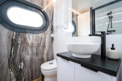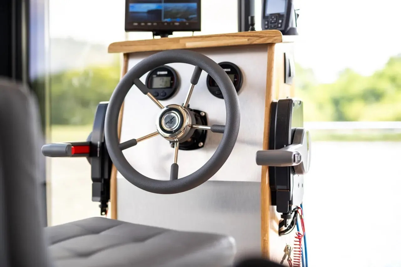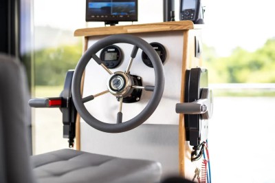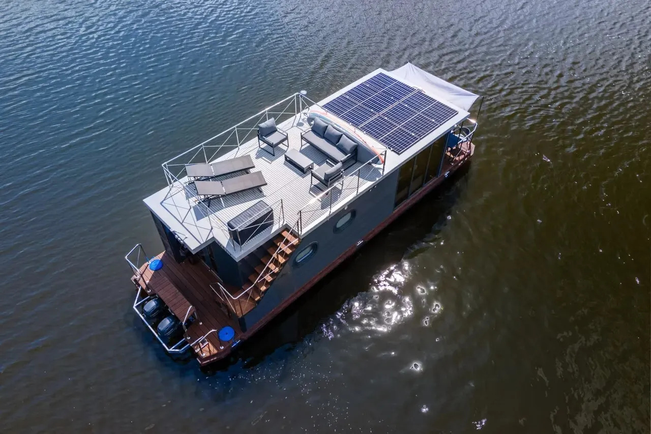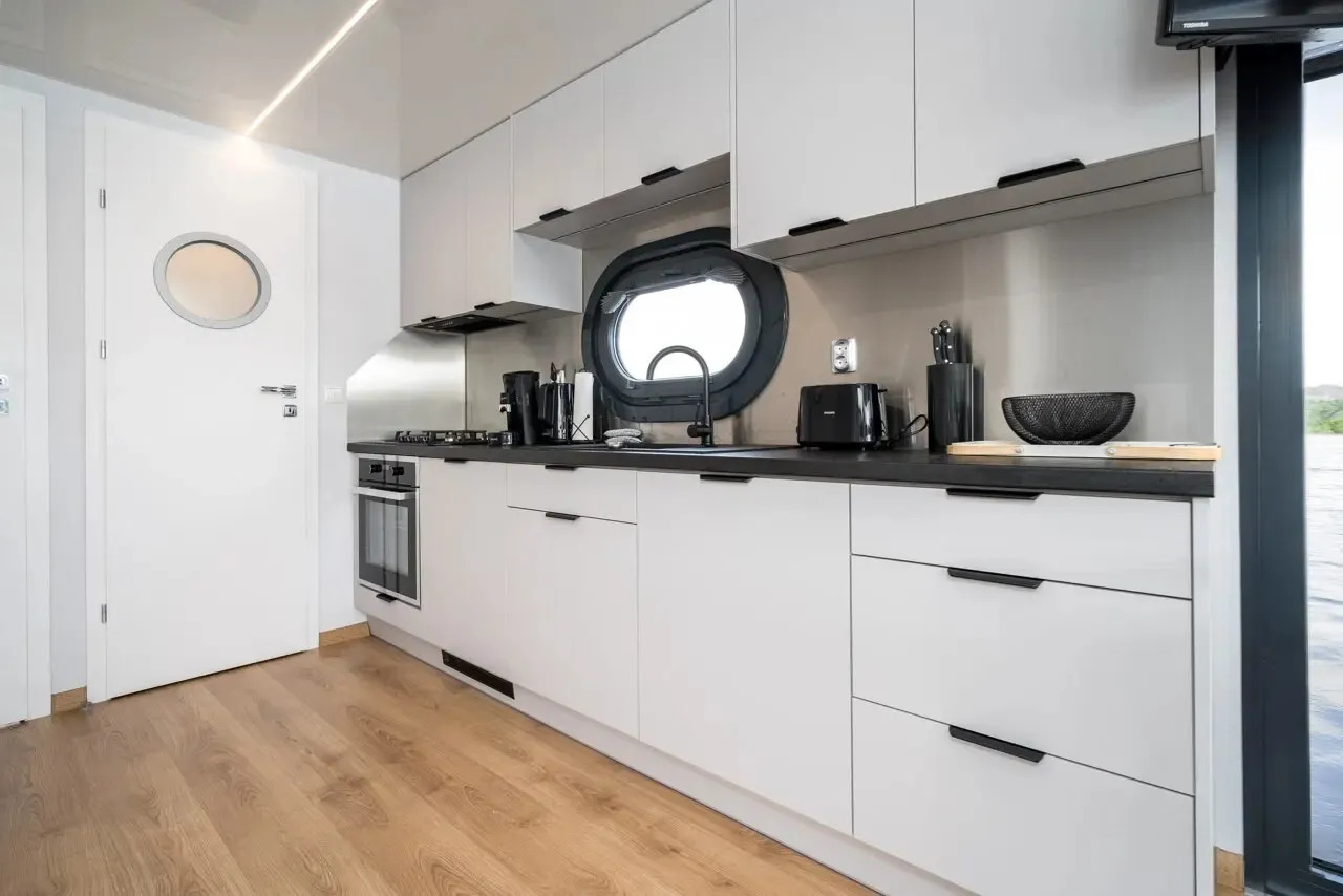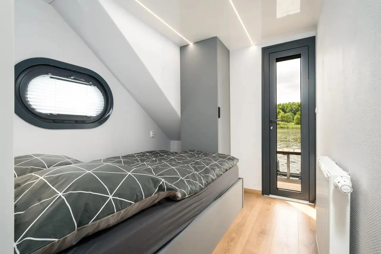 Infinity, das Hausboot der neuesten Generation. Die perfekte Kombination aus innovativer Antriebstechnik und stilvollem Design. Die lnfinity verfügt über hervorragende Fahr- und Manövriereigenschaften, sodass es für jeden die Möglichkeit gibt, einen traumhaften Urlaub auf dem Wasser zu verbringen. Ohne Führerschein. Der Wohn- und Essbereich ist mit bodentiefen Schiebe- bzw. Panoramafenstern ausgestattet so das Sie einen eindrucksvollen Ausblick auf die Natur und das Wasser genießen können. Im Salon befindet sich eine ausladende Wohnlandschaft, auf der man es sich so richtig bequem machen kann. Falls die zwei Schlafzimmer nicht ausreichen, gibt es die Möglichkeit, mit wenigen Handgriffen die Wohnlandschaft zu einem weiteren Doppelbett zu verwandeln. Bei Sonnenaufgang frühstücken auf der Bugterrasse kein Problem, Tisch und vier bequeme Stühle bieten ausreichend Platz für die ganze Familie. Hier befindet sich auch das Sonnensegel, das Sie anbringen können, falls es oben auf der Dachterrasse doch mal zu heiß wird. Runder Esstisch mit vier Stühlen. Steuerstand mit ,,Kapitänsstuhl". Ein Flachbildschirm-TV ist selbstverständlich auch vorhanden. Die angrenzende helle, moderne Küchenzeile besticht durch ihre cleane Eleganz. Sie ist mit allem ausgestattet, was man für einen entspannten Aufenthalt braucht. Bitte vergessen Sie nicht ihre Lieblings-Kaffeepads von Senseo mitzubringen. Das vollwertige Bad, mit großer Dusche, der Marmoroptik, seinen schwarzen Armaturen und dem Aufsatzwaschbecken besticht durch sein edles Design. Vom Salon aus erreichen Sie die beiden separaten Schlafzimmer, eins ist mit Doppelbett (140 cm x 200 cm) das zweite Schlafzimmer mit ausziehbarer Couch( Liegefläche140 x 200cm) ausgestattet. Beide Schlafzimmer verfügen über einen eigenen Zugang zur Heckterrasse. Mehr Privatsphäre geht nicht. Von der Heckterrasse aus bietet Ihnen eine Badeleiter und eine Badeplattform einen komfortablen Zugang zum Wasser. Ein weiteres Highlight ist die separate Außendusche mit Frischwasser, welche für Erfrischung an heißen Tagen sorgt. Ob Sport oder einfach nur ein gemütliches Treiben, mit dem SUP am Board welches inklusive ist, kann das unter Dir hinwegfließende Wasser, die Ruhe und die Natur um Dich beruhigend und entspannend für die Seele wirken . Über eine angenehm breite Holztreppe mit Geländer erreichen Sie bequem die Dachterrasse. Machen Sie es sich bei einem Glas Wein auf der möblierten Dachterrasse gemütlich. Hier kann man die Seele baumeln lassen und die Ruhe auf sich wirken lassen. Entspannung, Erholung und Entschleunigung par excellence. Beim Bau der Infinity wurde auch schon auf Nachhaltigkeit geachtet. Sowohl die Bug als auch die Heckterrasse und die Treppe zur Dachterrasse wurden aus Bambus gebaut. Durch die großen Sonnenkollektoren mit dem Batteriespeicher ist es ein smartes Hausboot. Last but not least - die "Infinity" verfügt über einen bootseigenen LTE-WLAN Router. ln der Nebensaison sorgt die Zentralheizung mit Warmwasseraufbereitung wohlige Wärme. ,,lnfinity" für Design-Lovers. Für den ultimativen Freizeitspaß mitten in der Natur.