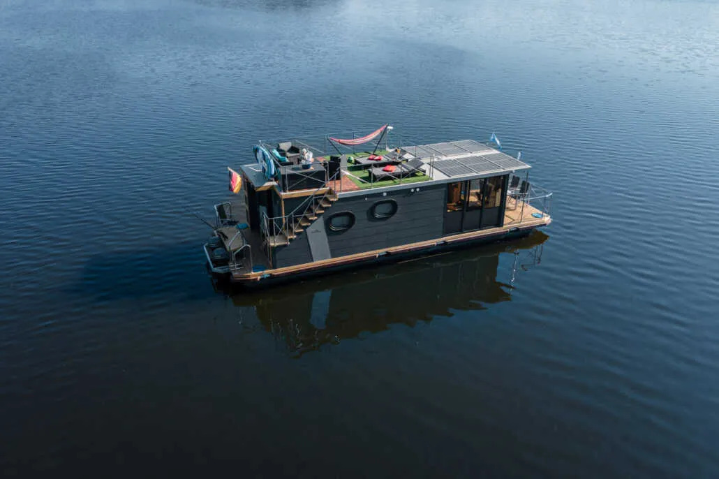 Das Wohnzimmer mit bodentiefen Panorama-Schiebefenstern und der große Wohnbereich laden zum Verweilen ein, hier kann man wunderbar die Seele baumeln lassen. Großzügige Fensterflächen bieten einen tollen Blick auf das Wasser und die Natur. Sollten zwei getrennte Schlafzimmer nicht ausreichen, lässt sich die Wohnlandschaft bequem mit wenigen Handgriffen in ein komfortables Doppelbett verwandeln. Durch große Glasschiebetüren gelangen Sie auf die angrenzende Bugterrasse, hier steht ein Tisch mit Stühlen für ein Frühstück, Abendessen oder einfach nur ein Glas Wein bereit. Im Wohnzimmer befindet sich außerdem ein Esstisch mit 4 Stühlen (der auf 6 ausgeklappt werden kann) und ein Steuerstand mit einem „Kapitänsstuhl“, von dem aus das Hausboot über die Seen und durch die Kanäle gesteuert wird. Dem Kapitän steht modernste Navigationstechnik zur Verfügung, damit jedes Ziel erreicht werden kann. Die angrenzende offene Küche bietet nicht nur viel Stauraum, eine große Arbeitsfläche, einen Gasherd, Backofen und Kühlschrank, sondern ist auch mit allem ausgestattet, was Sie benötigen, um sich selbst zu verpflegen . Im Badezimmer finden Sie einen stilvollen Aufsatzwaschtisch mit Schrank und viel Platz für Ihre Badutensilien, sowie einem WC und Duschkabine. Vom Wohnzimmer aus gelangen Sie in zwei separate Schlafzimmer, von denen eines mit einem Doppelbett 140 x 200 cm und das andere mit einem Etagenbett ausgestattet ist. Genügend Stauraum finden Sie in den beiden Kleiderschränken und Schubladen unter dem Bett. Das Highlight ist aber, dass beide Schlafzimmer einen eigenen Zugang zur Heckterrasse haben, mehr Privatsphäre geht nicht. Da Sie im Normalfall immer mit dem Heck anlegen, muss niemand durch Ihr Schlafzimmer gehen, um in die Lounge zu gelangen oder umgekehrt, von der Lounge auf die Dachterrasse. Über eine breite Holztreppe erreichen Sie ganz bequem die große, möblierte Dachterrasse, die zum Sonnenbaden oder einem gemütlichen Grillabend einlädt. Es erwartet Sie ein toller Ausblick auf die grandiose Landschaft. Oder Sie lehnen sich auf einer der Sonnenliegen zurück und genießen die Ruhe und einen der wunderschönen Sonnenuntergänge.