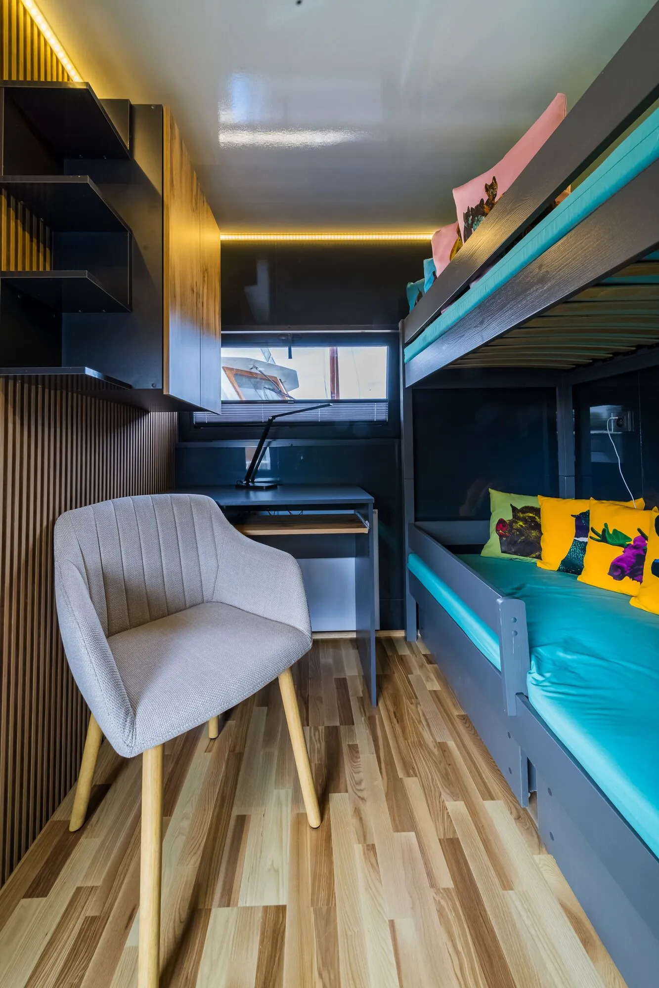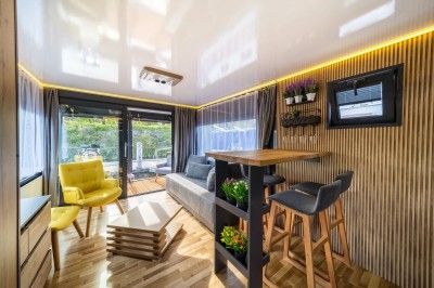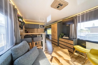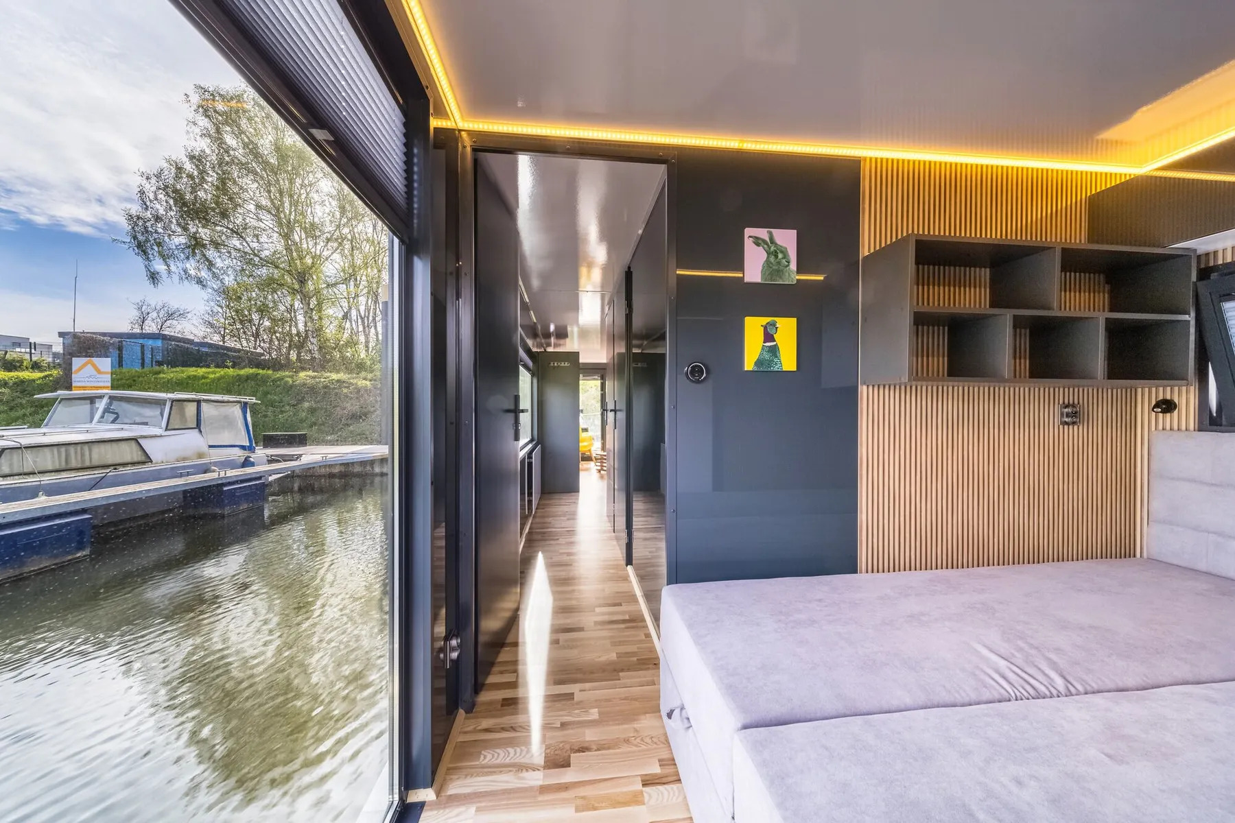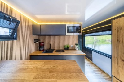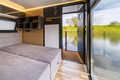 Ciao Alltag, Hallo Urlaub! Verbringen Sie auf dem Hausboot Bella Vista eine entspannte Auszeit am und auf dem Wasser inmitten der wunderschönen Natur der Mecklenburgischen Seenplatte. Der Salon mit den bodentiefen Panoramafenstern und der großen Wohnlandschaft lädt zum Verweilen ein, hier kann man wunderbar die Seele baumeln lassen. Durch die großzügigen Fensterflächen haben Sie einen herrlichen Ausblick aufs Wasser und die Natur. Die Wohncouch lässt sich mit wenigen Handgriffen in ein bequemes zusätzliches Doppelbett (ca.140 x 200 cm) verwandeln, sollten die beiden separaten Zimmer mal nicht ausreichen. Der vielfältig ausgestattete Küchenbereich ist ideal, um sich selbst zu verwöhnen. Im Bad mit einem Spiegelschrank und einem Waschbecken mit Unterschrank finden Sie das WC und eine geräumige Duschkabine vor. Zusätzlich stehen zwei separate Zimmer zur Verfügung. Eines davon ist ein Schlafzimmer mit einem Doppelbett (ca. 140 x 200 cm). Das andere Zimmer ist mit einem kleinen Schreibtisch und mit 2 Einzelbetten als Doppelstockbett je ca. 80 x180 cm ausgestattet, beide zulässig bis zu einem Gewicht von 50 kg. Über die Treppe erreichen Sie ganz bequem die große möblierte Dachterrasse, die zum Sonnenbaden oder zu einem gemütlichen Verweilen einlädt. Es erwarten Sie schöne Ausblicke auf die wunderbare Seenlandschaft und eine unvergessliche Zeit auf der Bella Vista. Lassen Sie sich bezaubern.