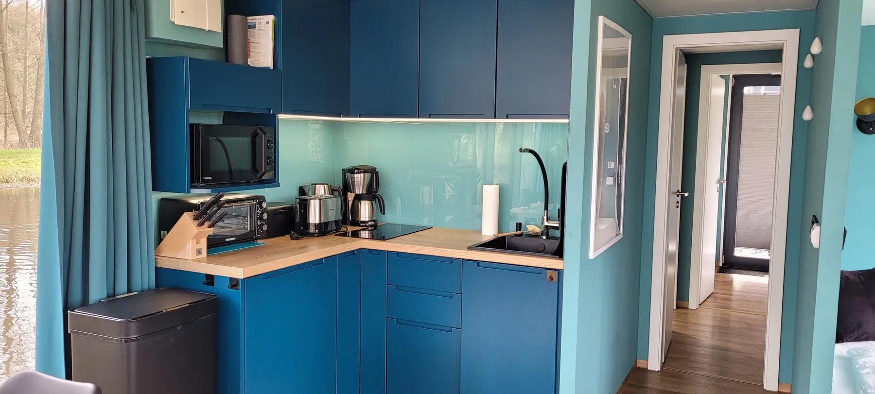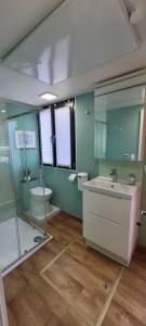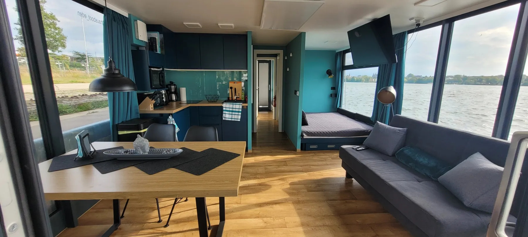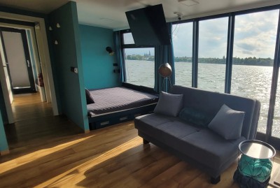 Willkommen auf dem Luxus-Sauna Hausboot, der Eden. Erbaut 2022, mit ausreichend Platz auf ca. 40 qm Wohnfläche und ebenso großer Dachterrasse mit Sonnensegel. Durch bodentiefe und vollflächige Schiebetüren erreichen Sie von der Terrasse aus, den wunderschönen, vollverglasten Wohnbereich, der sofort Eindruck hinterlässt und zum verweilen einlädt. Die angrenzende, komplett ausgestattete, moderne Einbauküche mit Cerankochfeld, Kühlschrank mit Eisfach, Minibackofen und Mikrowelle lädt zum Kochen und verweilen in toller Atmosphäre ein. Genügend Stauraum ist auch für längere Touren vorhanden. Der Esstisch ist groß genug, um mit allen an Bord ein schönes Frühstück, Mittag oder Abendessen zu genießen. Ein bequemes Sofa mit zusätzlichen Kissen und Kuscheldecken, welches bei Bedarf ausklappbar ist,kann sowohl als Ruheplatz zur Mittagsstunde oder für gemütliche Abende mit Familie oder Freunden genutzt werden. Die Eden verfügt über zwei getrennte Schlafbereiche mit jeweils einem 160 cm breitem Doppelbett und einem Bett( im vorderen Bereich) mit 220 cm Überlänge für die Großen unter uns, bequeme, durchgängige Matratzen mit Kissen und Bettdecken sorgen für erholsame Nächte auf dem Wasser. Über den Flur entlang erreichen Sie das großzügige Badezimmer mit der 100/100 cm großen Dusche, dem integrierten Waschtisch und einem vollwertigen WC. Die gleich angrenzende Sauna ( welche unabhängig vom Landstrom funktioniert) mit Blick auf die Natur, ermöglicht ein unbeschreibliches Erlebnis. Für die anschließende Abkühlung sorgt der See oder der 600 L-Wassertank. Im hinteren Bereich finden Sie den zweiten Schlafbereich, eine große Schrankwand und Bettkästen liefern zusätzlichen Stauraum. Wer Abends nicht auf seine Serien oder Filme verzichten möchte, hat die Möglichkeit diese vom Wohn- oder Schlafbereich zu schauen. Dieses moderne Hausboot ist mit 2 streamingfähigen Flat-TV ausgestattet, einem Telekom 5G-WLAN-Router (inclusive) und TV-Stick. Alle Räume verfügen über superschnelle Infrarot-Deckenheizungen,was an kühlen Sommerabenden für Wohlbehagen sorgt. Der Internet-Empfang kann je nach Standort natürlich variieren. Die großzügige Dachterrasse erreichen sie über eine sichere Treppe am Heck. Wer einfach nur die Ruhe mit einem Buch in der Hand, ein Sonnenbad nach dem Baden oder einfach einen gemütlichen Grillabend verbringen möchte, hat von dieser Terrasse aus den besten Blick auf die umliegende Natur. Hobbygriller, die auch im Urlaub nicht auf ein tolles Steak verzichten möchten, haben die Option den Gasgrill mit direktem Gasanschluss auf der hinteren Terrasse zu nutzen.(kostenfrei) Die 1200 Watt-Photovoltaikanlage liefert zusätzlichen Strom für weitere Extras an Board: Bluetooth-Lautsprecher, Haarföhn, Akku-Staubsauger. Es gibt mehrere USB-Steckdosen. Für den Fahrspaß sorgt der 50PS-Außenbordmotor und der 100 L-Benzintank. Bug- und Heckstrahlruder sowie eine Rückfahrkamera unterstützen und erleichtern das Manövrieren auf engerem Raum. Genießen Sie einen unvergesslichen Traumurlaub auf diesem eleganten Hausboot, wir sind uns sicher Sie werden sich wohlfühlen.